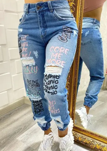 2023 nova carta impressão slant bolso rasgado jeans casual feminino
