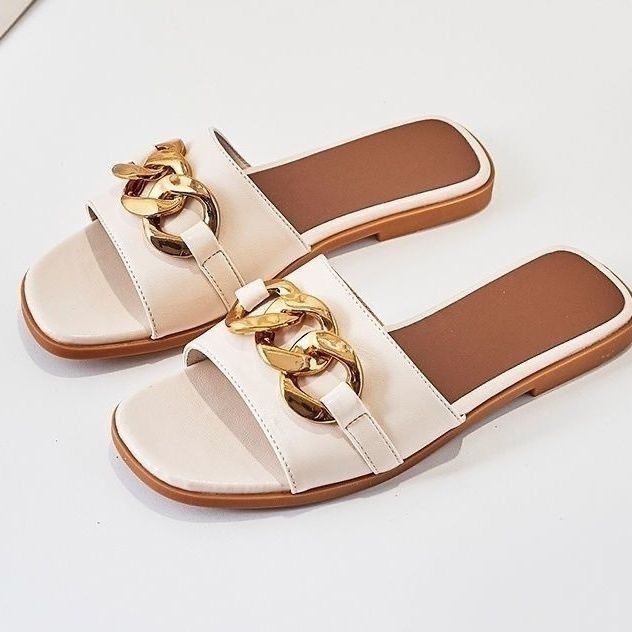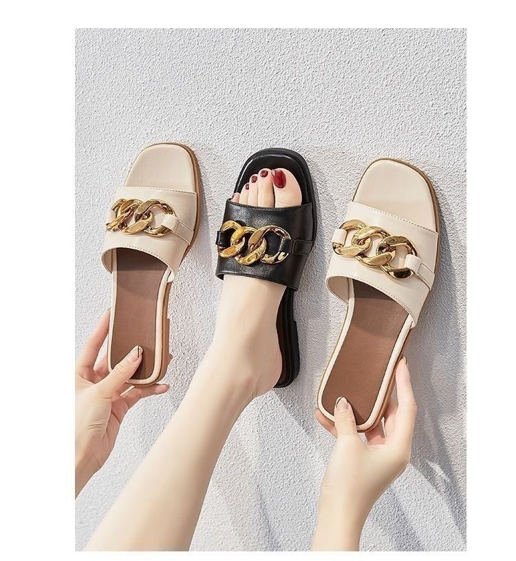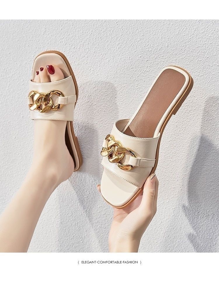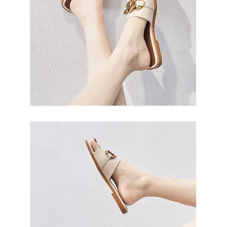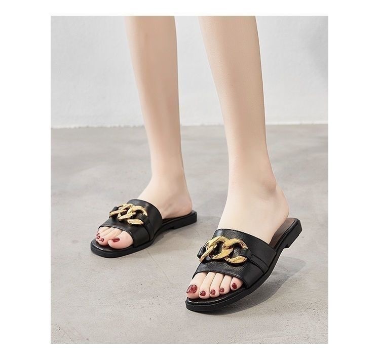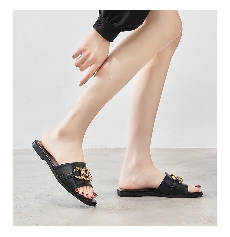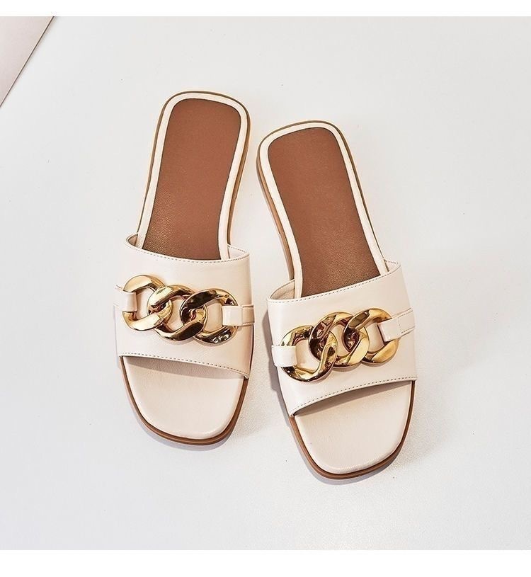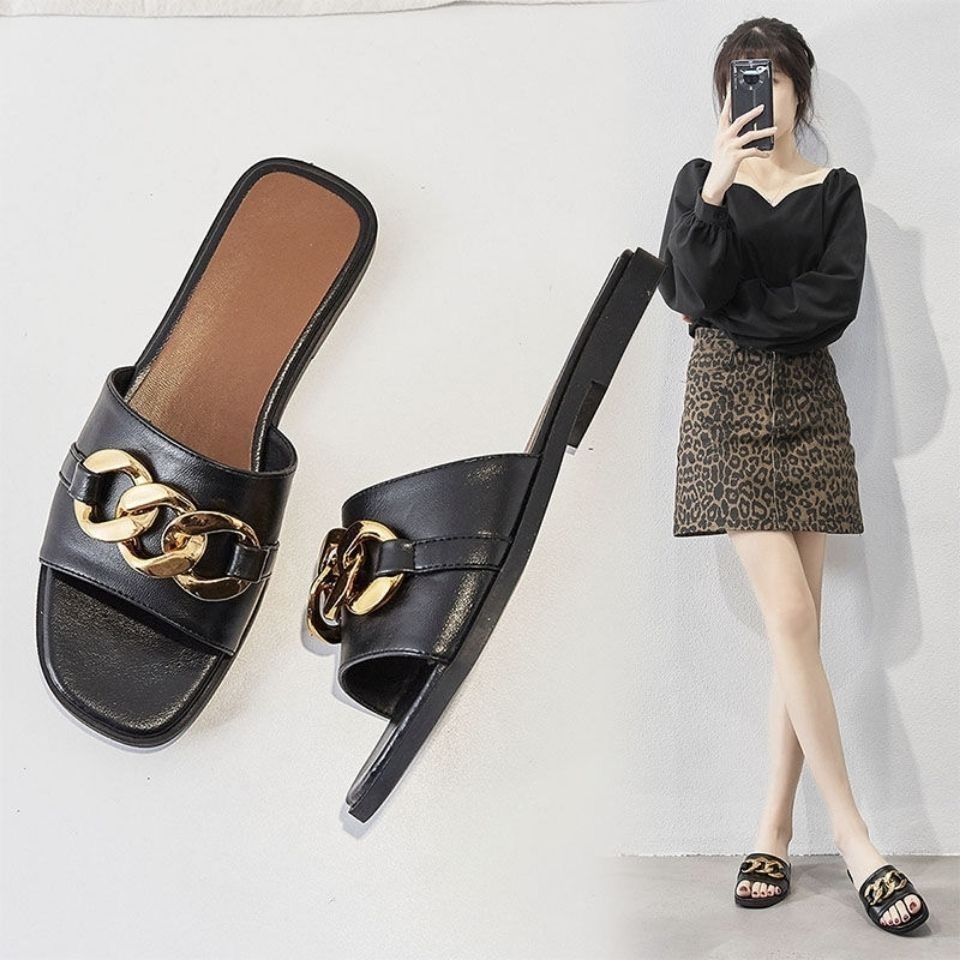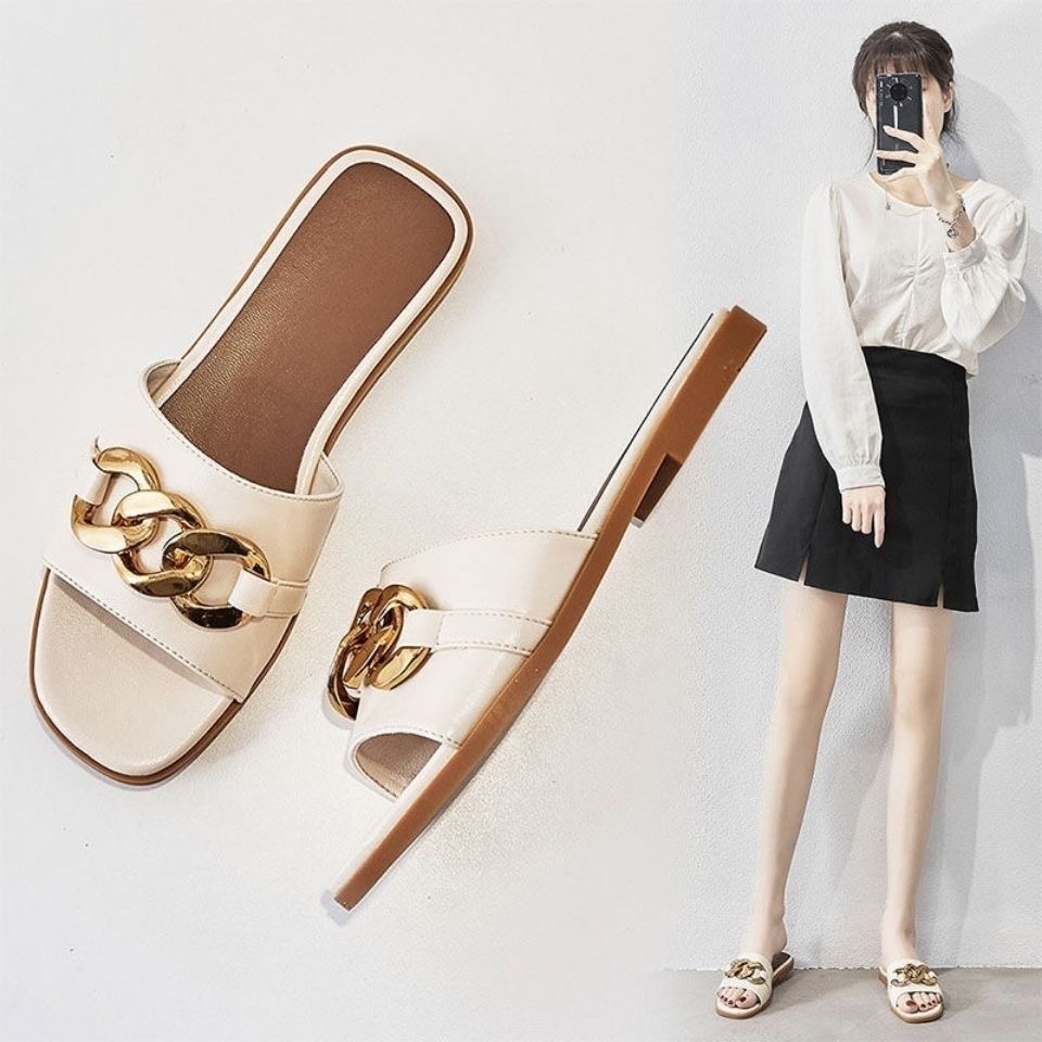 Qi Yan ~ Chinelos femininos para agasalhos de verão, novas cadeias de moda de celebridades da Internet, sandálias planas de couro macio real